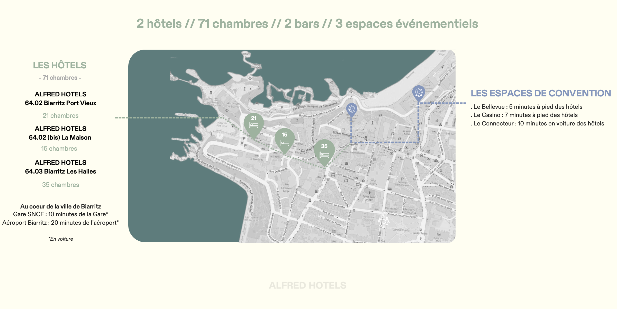 Alfred Hotels réinvente l’art de recevoir à Biarritz en proposant une hôtellerie élégante, intime et résolument contemporaine.À deux pas des plages et des Halles, l'établissement bénéficie d’un emplacement privilégié pour découvrir la ville à pied. Les chambres, confortables et raffinées, invitent à la détente, tandis que le petit-déjeuner gourmand célèbre des saveurs authentiques. L’expérience Alfred Hotels met à l’honneur l’identité et l’art de vivre du Pays Basque.