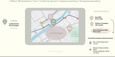 Situé au cœur de Compiègne, Alfred Hotels accueille aussi bien les voyageurs d’affaires que les touristes. Entièrement rénové en avril 2024, l’établissement propose 56 chambres totalisant 89 lits : chambres individuelles, doubles et suites familiales, idéales notamment pour les groupes de plus de quatre personnes. Pour l’organisation de vos événements professionnels, deux salles de séminaire entièrement équipées peuvent recevoir jusqu’à 50 participants.