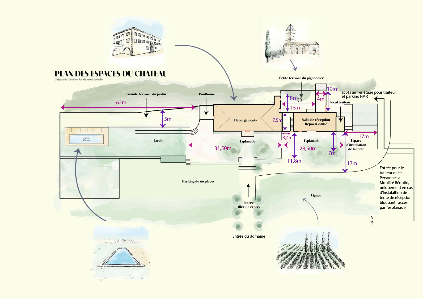 Le Château dispose d’une esplanade à l’ombre des platanes, et de deux terrasses pour organiser vos repas, vos temps de rencontres et de convivialité (jusqu'à 150 personnes debout).