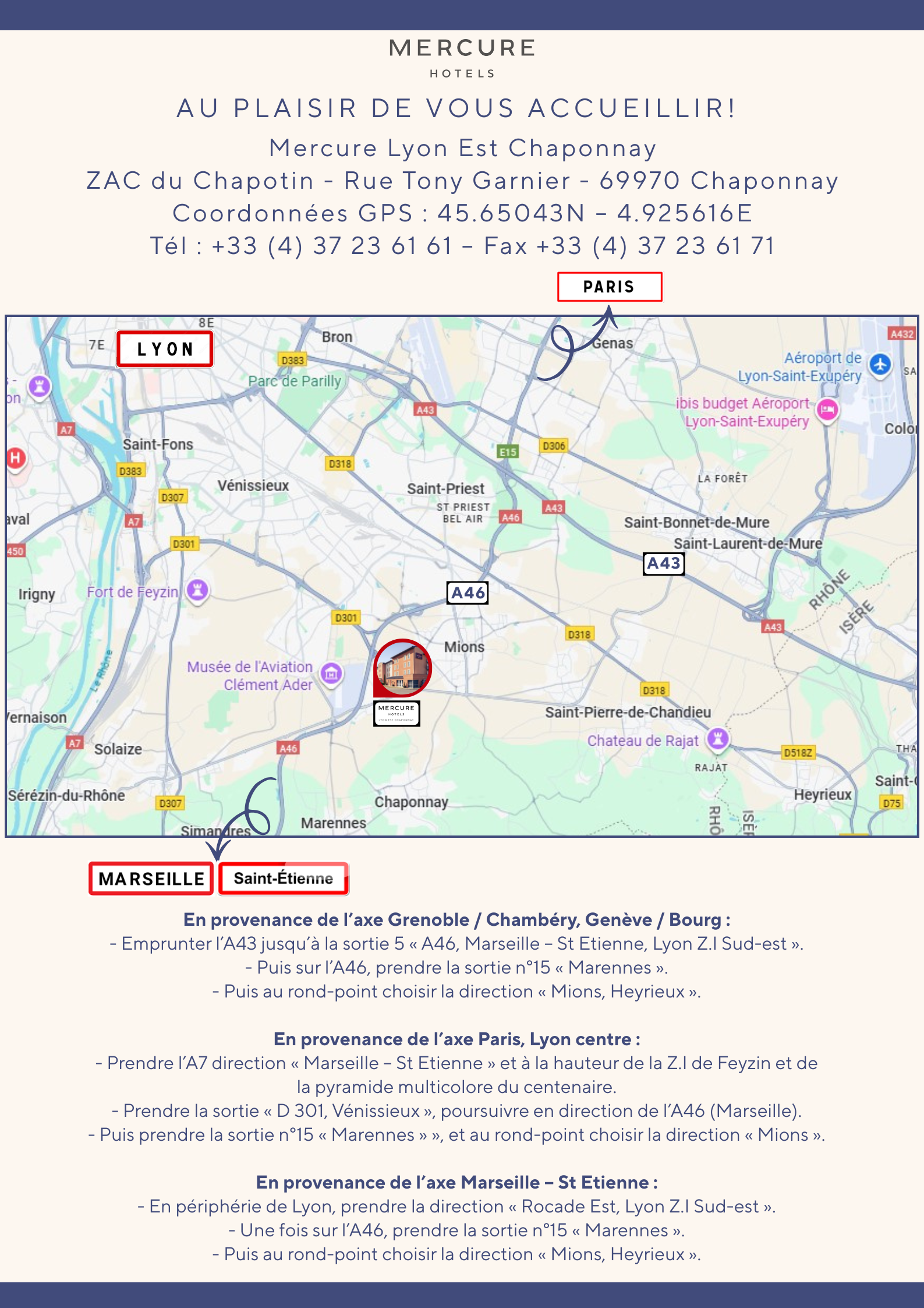 Pour les affaires ou les loisirs, le Mercure Lyon Est Chaponnay vous réserve un séjour agréable au sud-est de Lyon. Accueillant vos réunions professionnelles dans 2 salles de séminaire, notre hôtel à Chaponnay promet aussi de bons moments de détente. Venez découvrir la belle carte des vins de notre bar contemporain ou assister à une retransmission sportive sur écran géant. Dégustez nos plats maison dans le décor chaleureux de notre restaurant La Brasserie ou sur la terrasse ombragée.