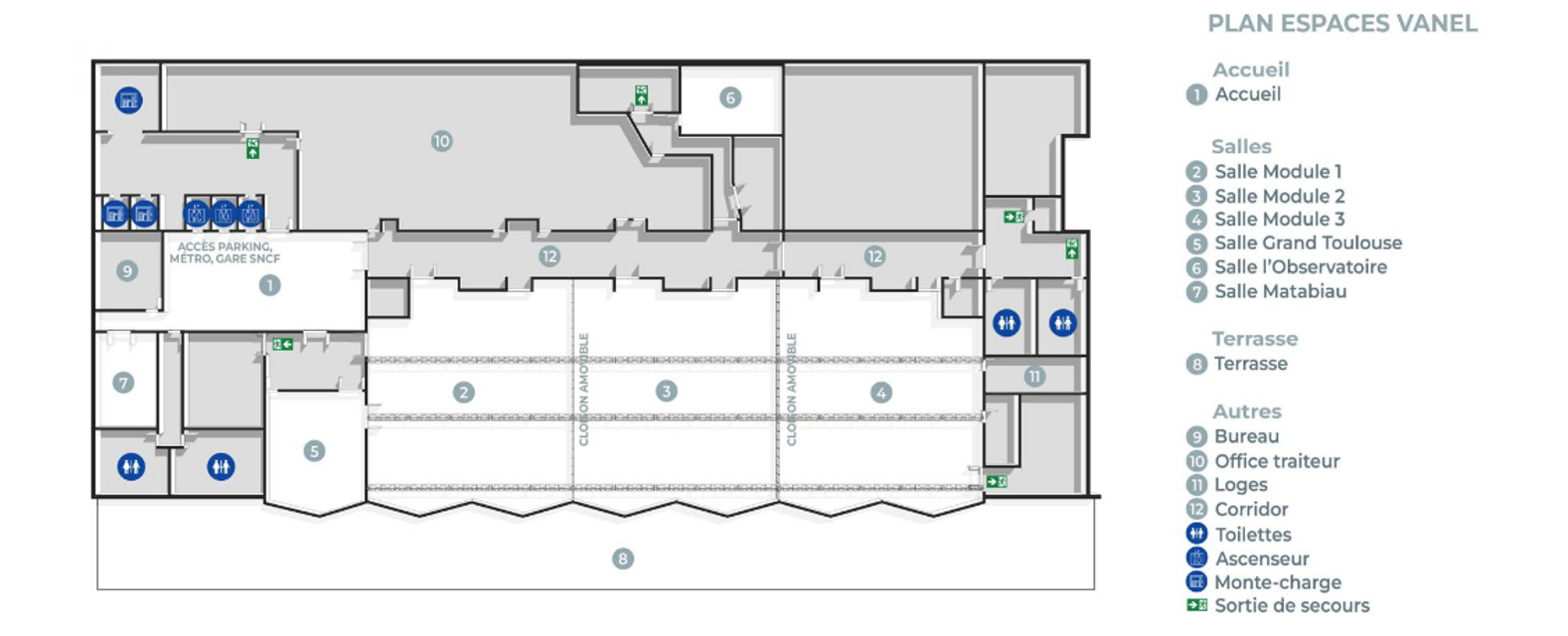 Les Espaces Vanel, un lieu réceptif d’exception situé au cœur de Toulouse est dédié à l’accueil de vos événements professionnels. Avec son atmosphère contemporaine et ses 1000m2 en configuration modulable, les Espaces Vanel offrent un cadre exceptionnel pour vos séminaires, conférences, expositions, assemblées générales, point presse … Sa terrasse panoramique de 370m2 sur les toits de Toulouse donne à vos participants une vue inégalable sur la ville rose… en mode rooftop !