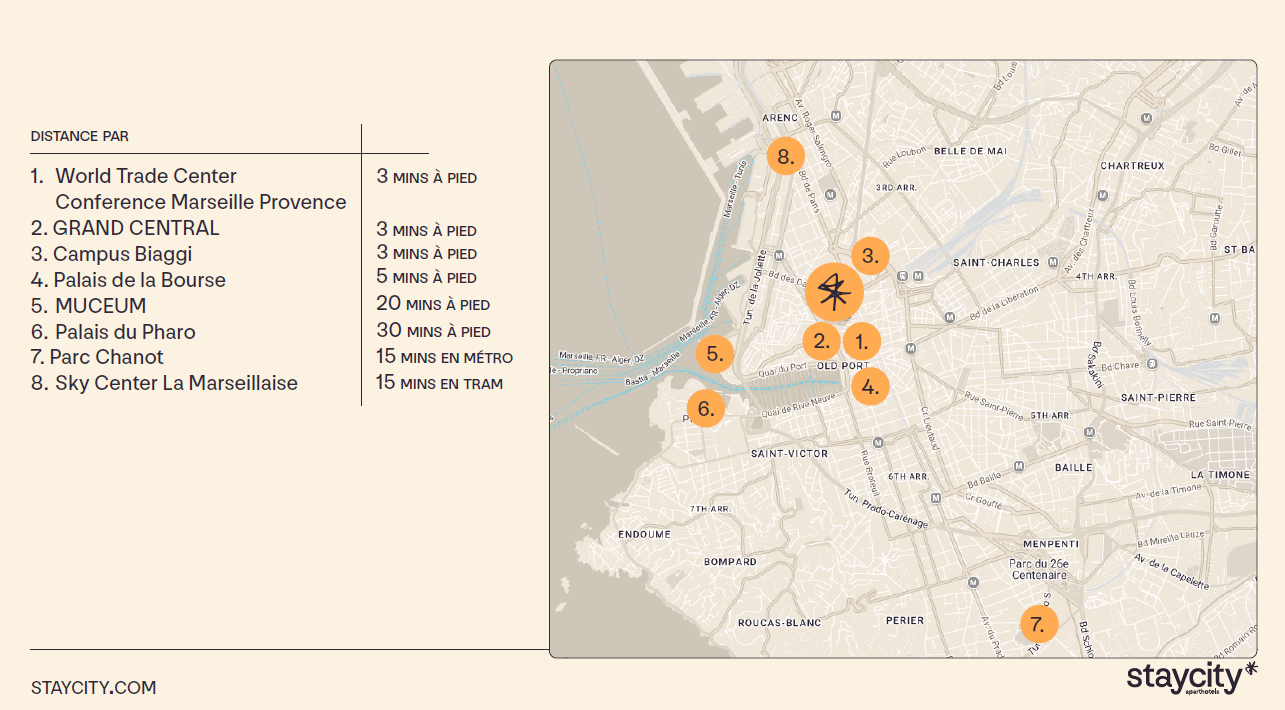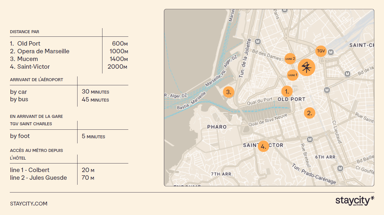 Au cœur de Marseille, à 5 min à pied du Vieux‑Port, Staycity Aparthotels Marseille Centre Vieux Port propose des studios et appartements modernes (jusqu’à 4 pers.), tous climatisés, avec kitchenette équipée, Wi‑Fi haut débit, ascenseur et réception ouverte 24 h/24. Idéal pour allier liberté d’un appartement et services hôteliers .