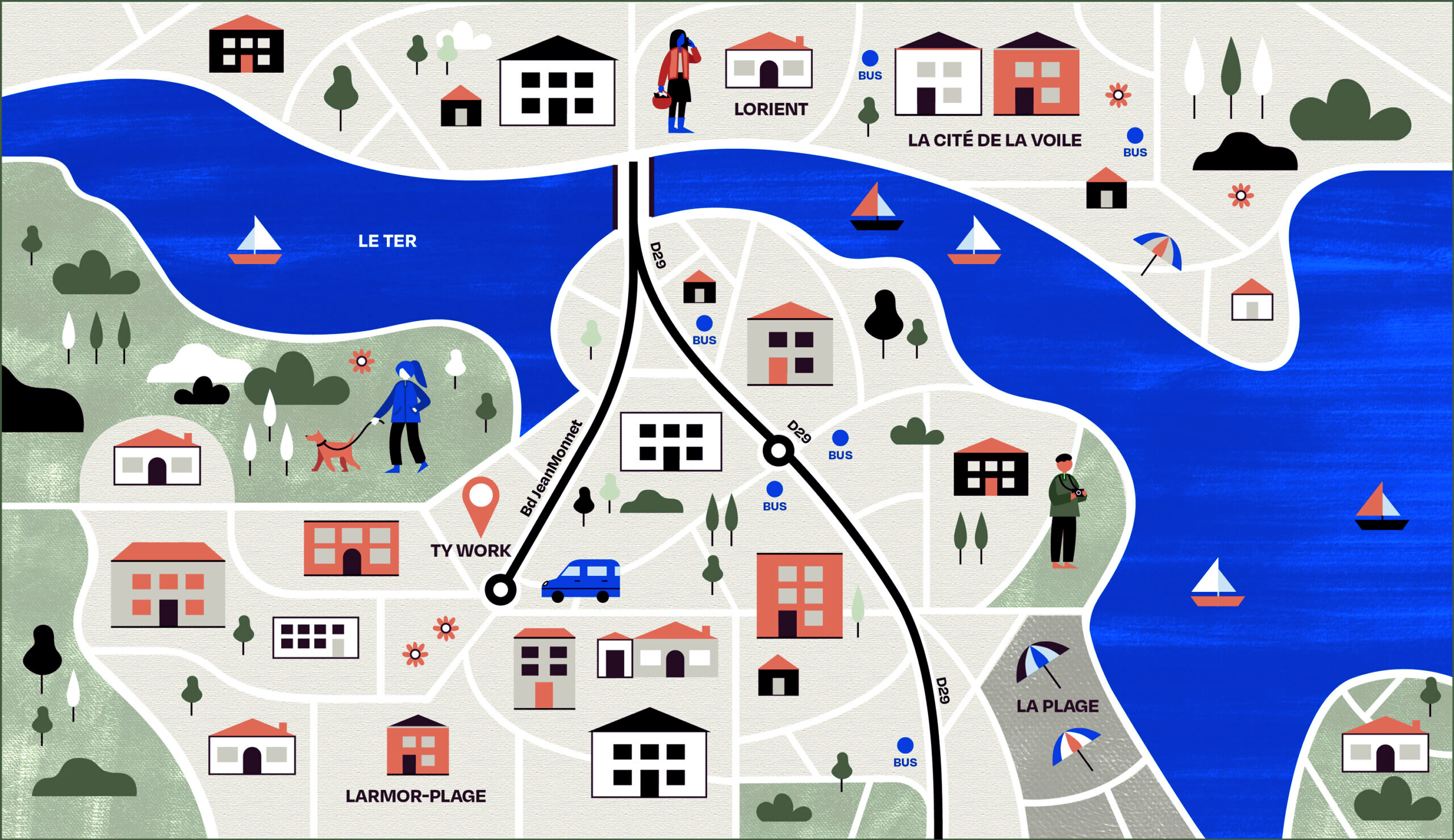 Vous cherchez un lieu unique pour développer votre activité dans un environnement professionnel et chaleureux ? Bienvenue à Ty Work, un centre d’affaires, location de salles et espace de coworking de 600 mètres carrés situé à Larmor Plage, en Bretagne, à proximité de l’étang du Ter et du centre Nautique Lorient La Base.
