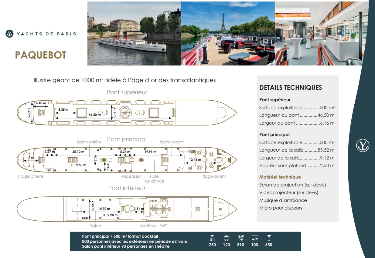 Embarquez pour un voyage transatlantique au cœur de Paris. Fidèle à l’âge d’or des grands liners, ce majestueux yacht à triple pont et cheminées emblématiques vous transporte sur la Seine et dans le temps. De ses ponts extérieurs panoramiques à ses vastes salons élégants, chaque détail sublime vos réceptions.